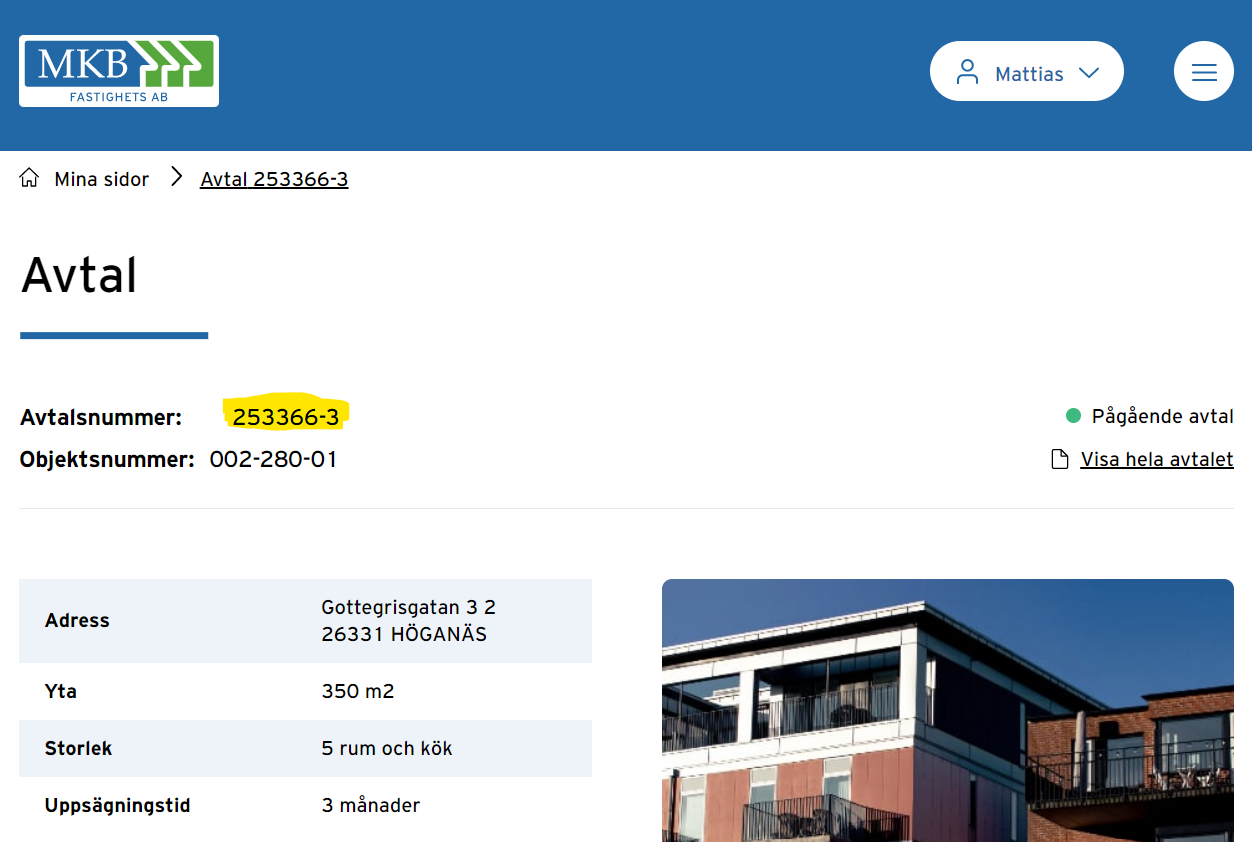 Ditt avtalsnummer kan behövas i kontakt med oss på MKB men också för att få rätt boendetid när du registrerar dig på Boplats syd.