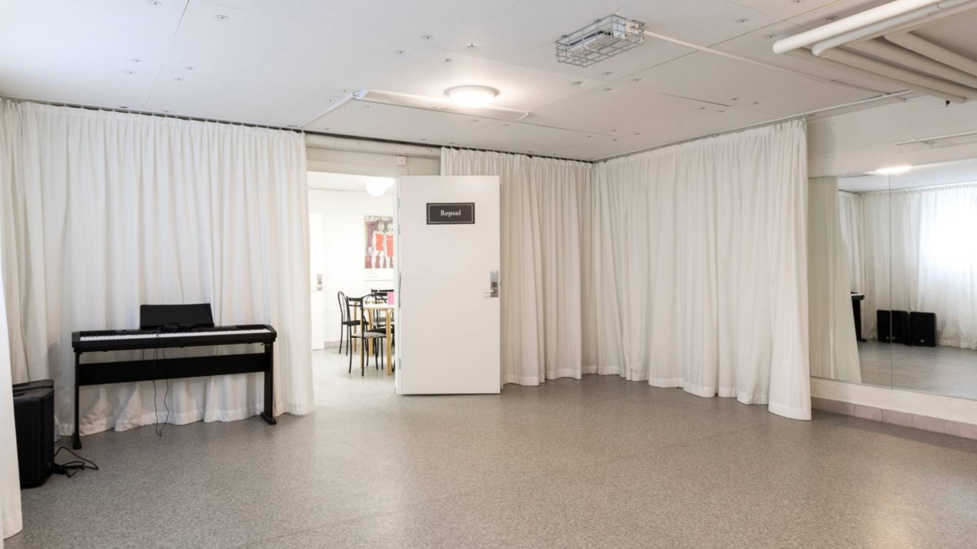 I repsalsdelen ingår en inklädd repsal på ca 30 kvm med spegelvägg och där finns även ett elpiano, högtalare och ett mindre ljudbord. Det ingår även ett omklädningsrum, ett läsrum och en toalett och det finns tillgång till kök.
