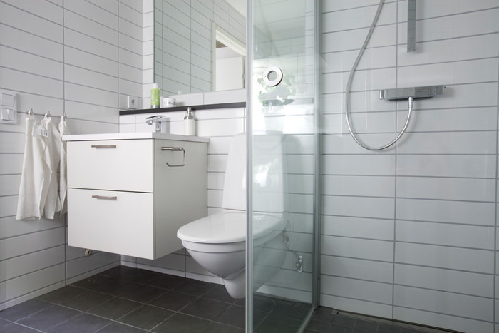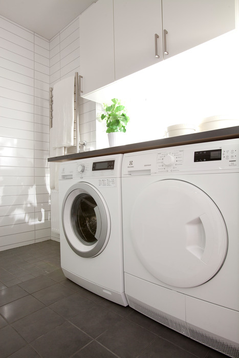 Tvättmaskin och torktumlare, badrumsskåp, handdukstork (el).