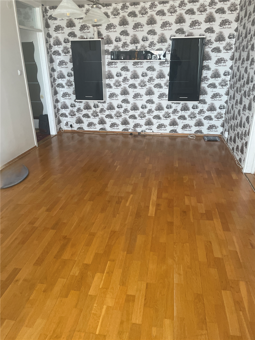 Parkettgolv i vardagsrum skall slipas och nya vita fotlister skall monteras.