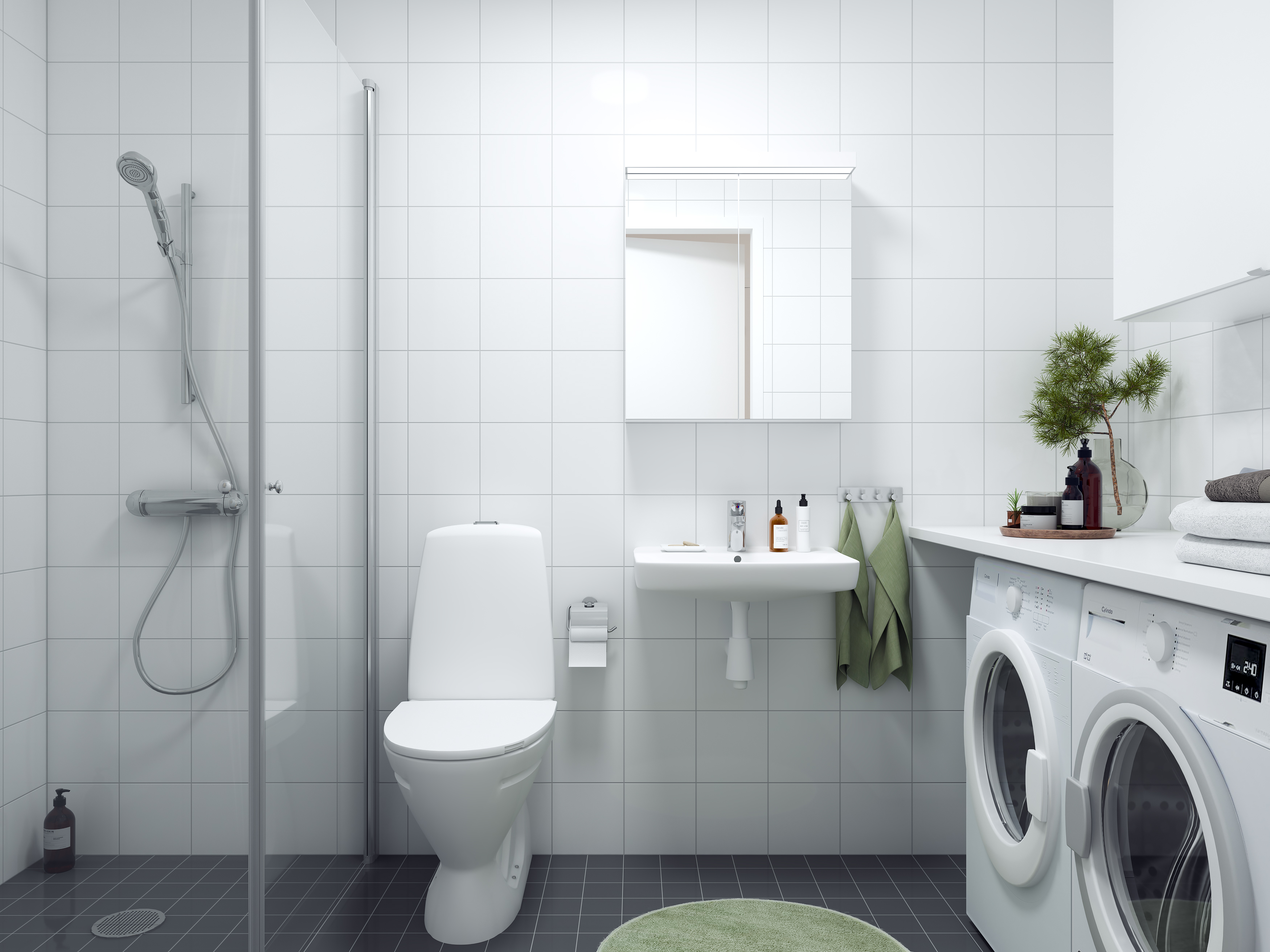 Övrigt: Tvättmaskin och torktumlare med vit laminatbänskskiva och skåp ovanför eller en kombinerad tvättmaskin/torktumlare. Duschvägg i glas. Handdukstork.
