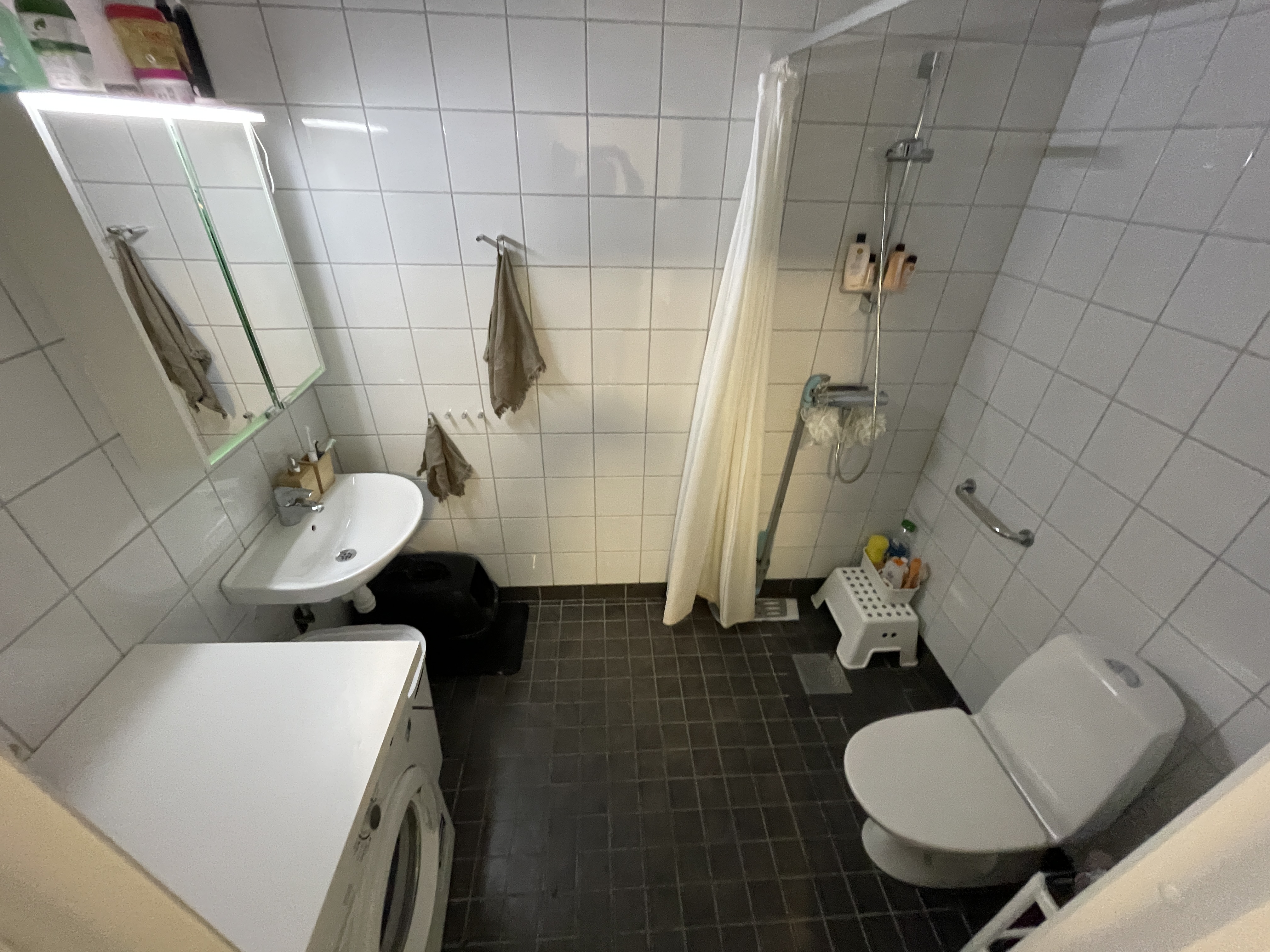 Utrustning: tvättställ, WC, dusch med draperi, handdukstork, kombitvättmaskin