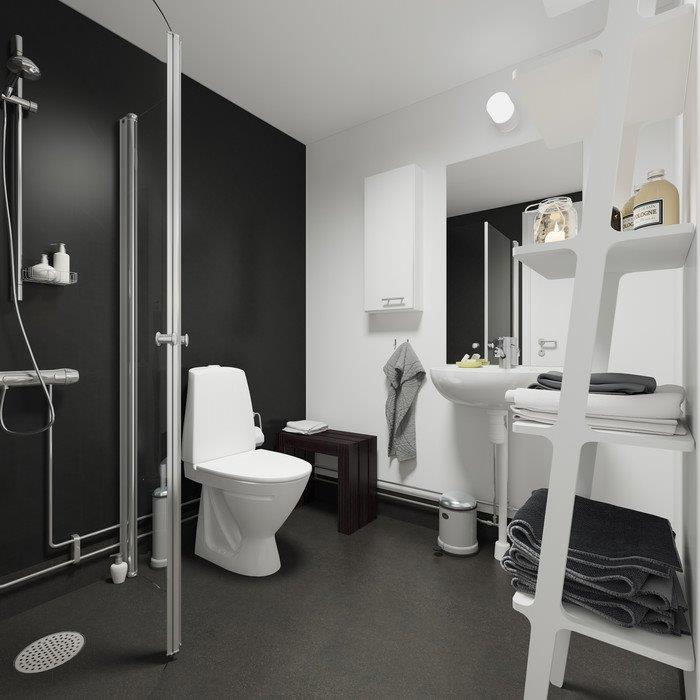 Vägg: Två svarta väggar med våtrumsmatta och övriga vita målade.