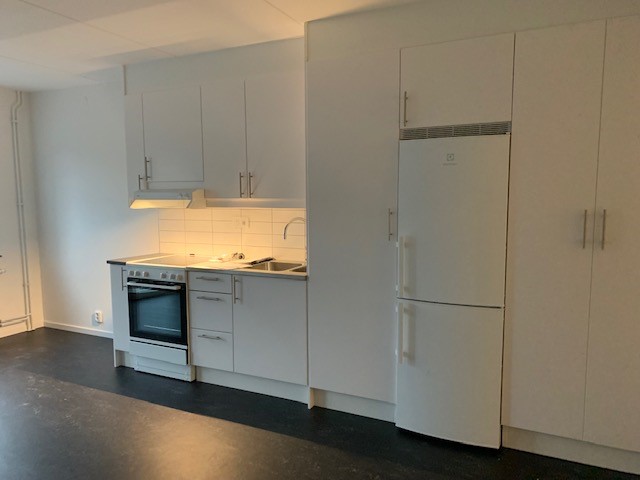 Vitvaror: Spis med häll, spisfläkt, vit kyl/ frys.