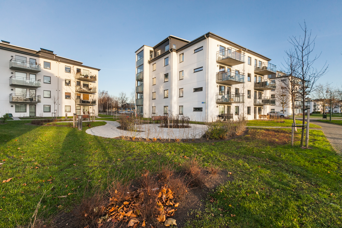 för att spara vatten och värmeenergi. Du betalar för din egen förbrukning. I anslutning till husen finns två stycken fristående miljöhus för källsortering där du kan sortera